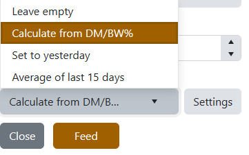 We just shipped a small change that pays off every single feed. The old "Set to yesterday" checkbox is gone. In its place: a dropdown with four ways to pre-fill the Amount to feed box the moment you click a pen.