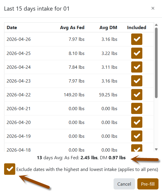 - Exclude dates with the highest and lowest intake (applies to all pens) — a one-click way to throw out outliers across every pen, every time. Set it once and forget it.