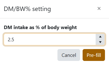 Click Settings to adjust your DM/BW% factor (the percentage of body weight you target as dry matter intake). Default is 2.5%. Change it once, and every pen you click recalculates with the new factor.