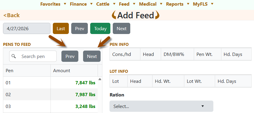 While you're at it, notice the new Prev and Next buttons in the Pens to feed search bar. Click through your pens in order without scrolling and re-clicking the grid. Each click reapplies your chosen default method — so if you're on Average of last 15 days, every pen you land on gets pre-filled instantly.